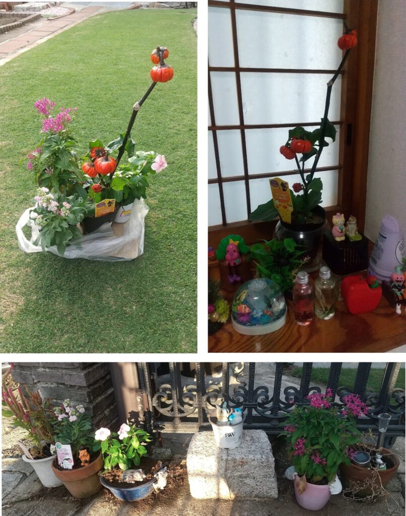 ママが、花を鉢植えにして、門の扉の前に並べました。