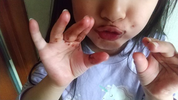 溶かしたチョコを手と口の周りにつけました。